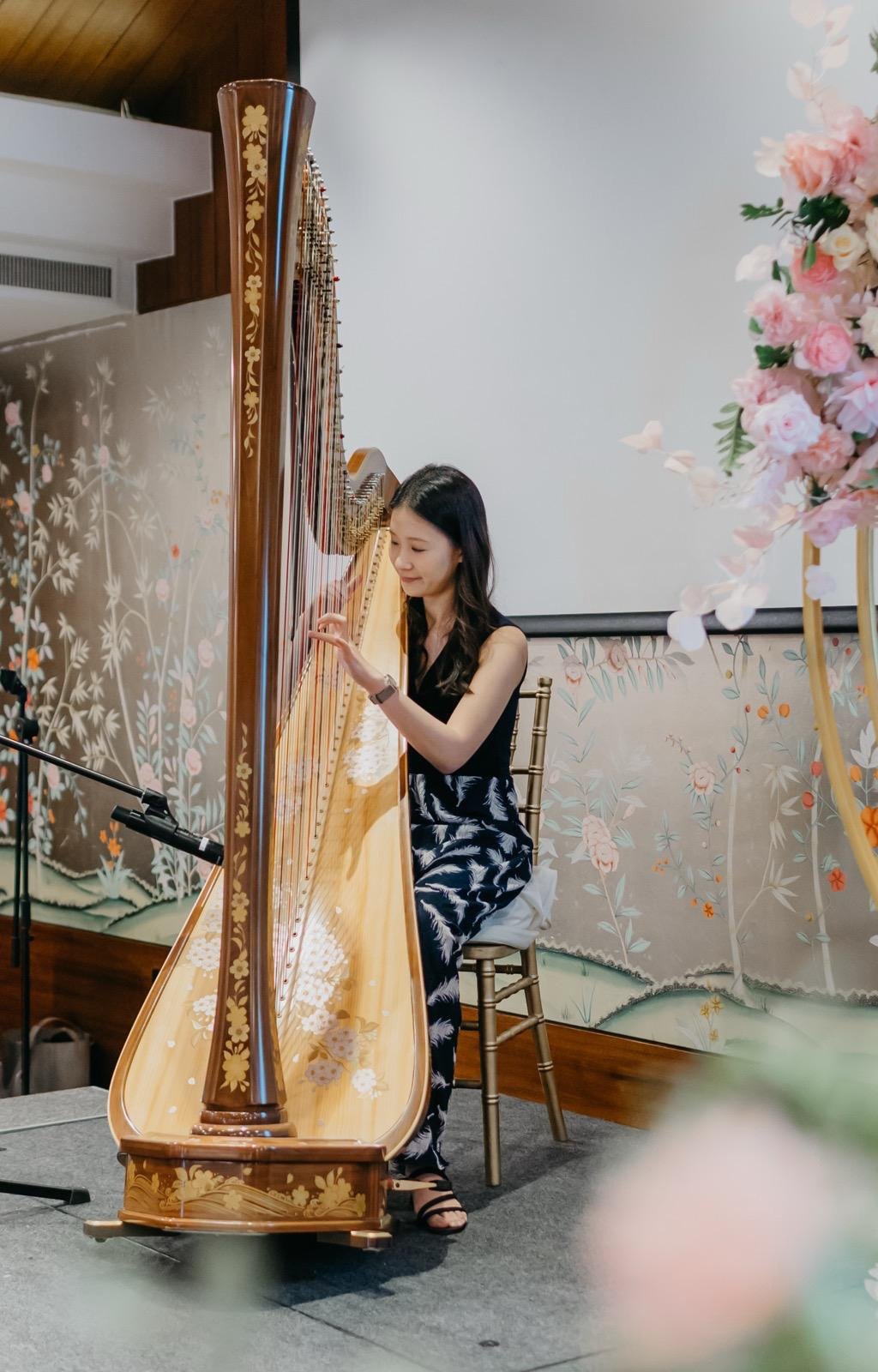 For this wedding, the couple requested that the harp remain on stage for the entire event, even when I wasn’t performing, and the moment I walked into the room, I saw why. The harp belonged. Its walnut wood perfectly matched the tones of the wooden panels on the ceiling and walls. The cherry blossoms on the harp reflected the floral art on the walls and the pink roses on stage.